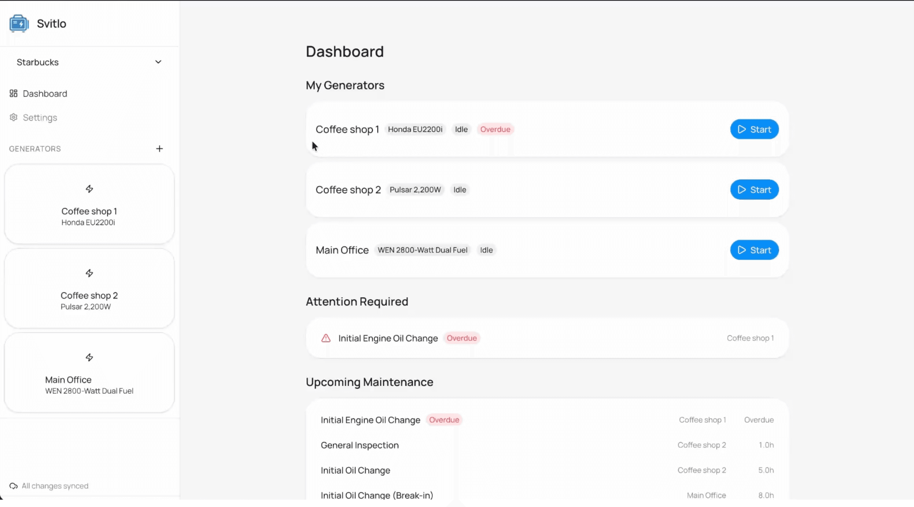 Svitlo is a local-first web application for tracking the usage and maintenance of power generators. It helps individuals and businesses know exactly when a generator needs maintenance, whether it has been running too long, and who last operated it.