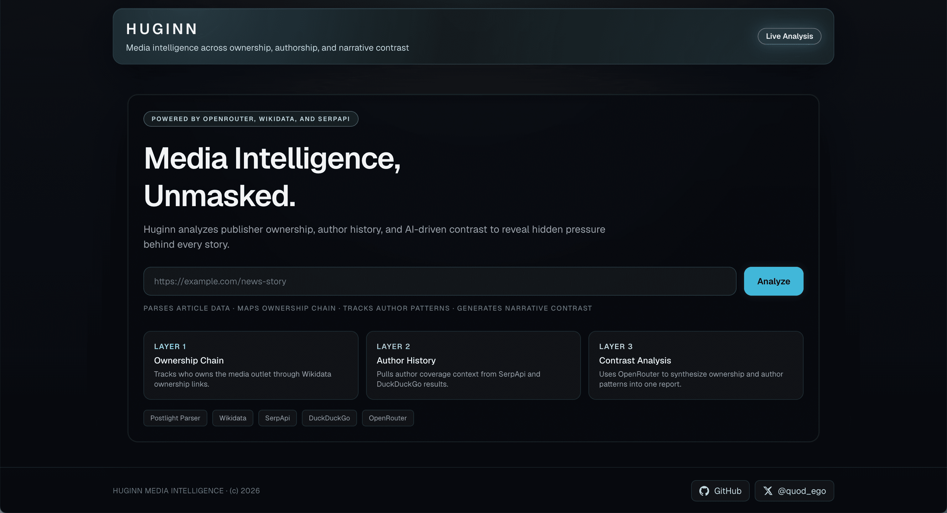 Paste a news article URL and Huginn tells you who owns the outlet, what the author has covered before, how their narrative deviates from the global consensus — and raises automated bias alerts when conflict-of-interest signals are detected.
