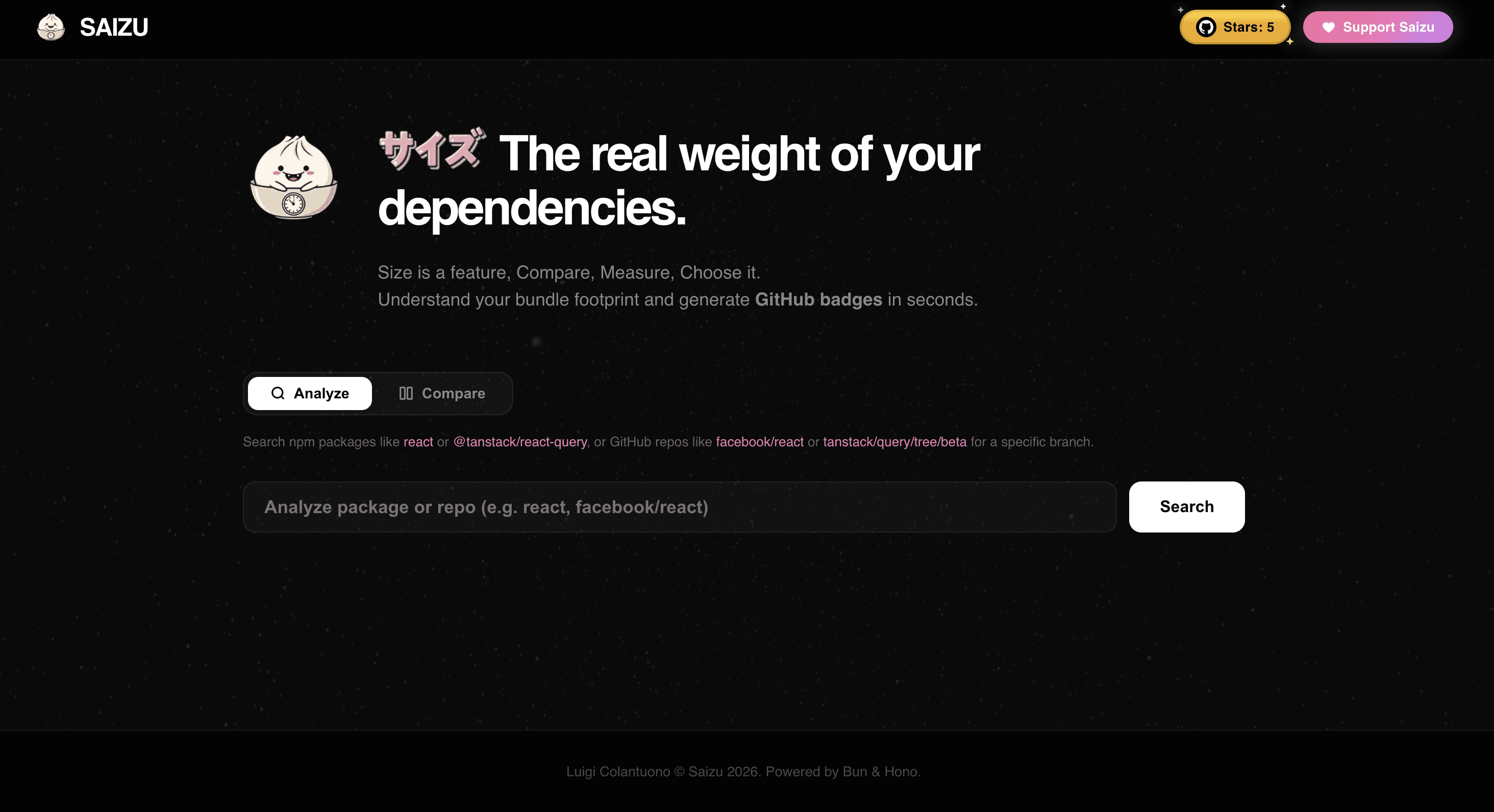 Saizu is a blazingly fast npm and GitHub repository analyzer built with Bun + Hono. It’s designed to provide the ground truth of any package footprint without the overhead of local builds.